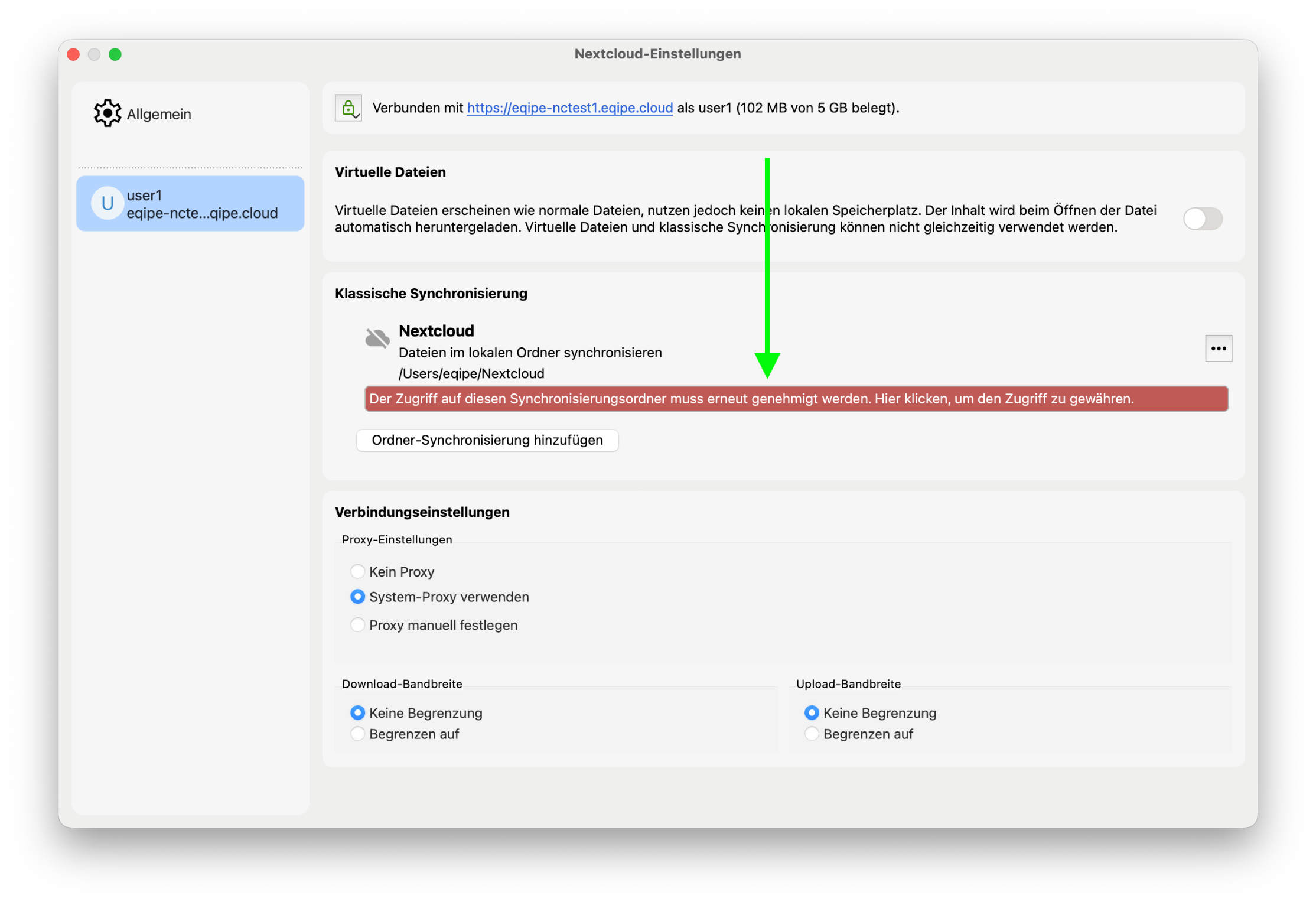 Die Einführung dieser neuen Sicherheitsarchitektur hat eine einmalige Konsequenz für bestehende Konfigurationen. macOS muss den Zugriff auf den bisherigen Synchronisierungsordner neu genehmigen. Ohne diese Freigabe kann der Client die Dateien im Sync-Ordner nicht mehr lesen oder schreiben, bis Sie den Zugriff erneut bestätigen.