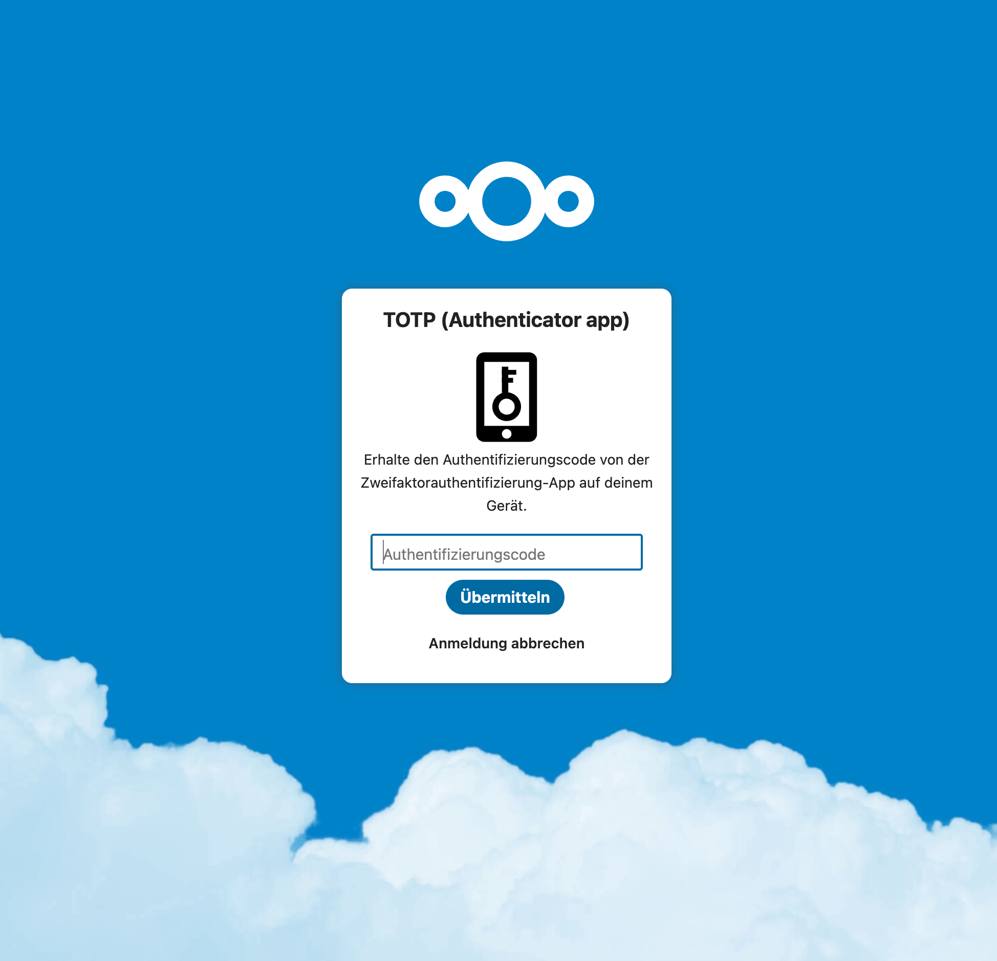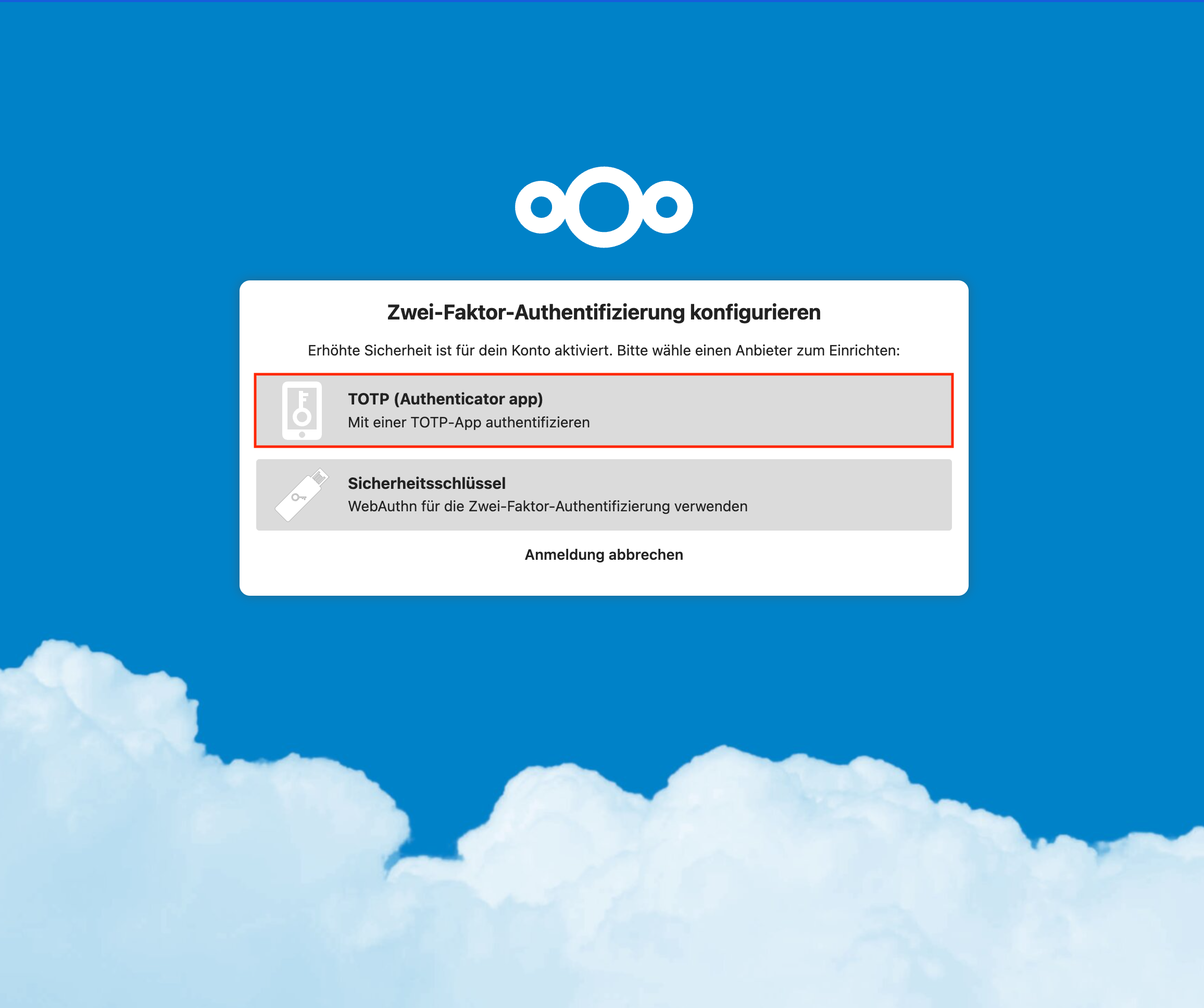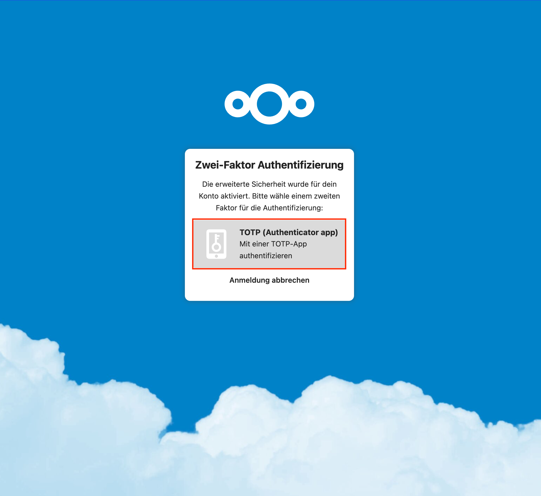 - Nach Eingabe der Nextcloud Benutzerdaten im Loginfenster erscheint die Auswahl der möglichen Zwei-Faktor-Authentifizierungsmethoden. In diesem Fall wird «TOTP (Authenticator app)» gewählt:
