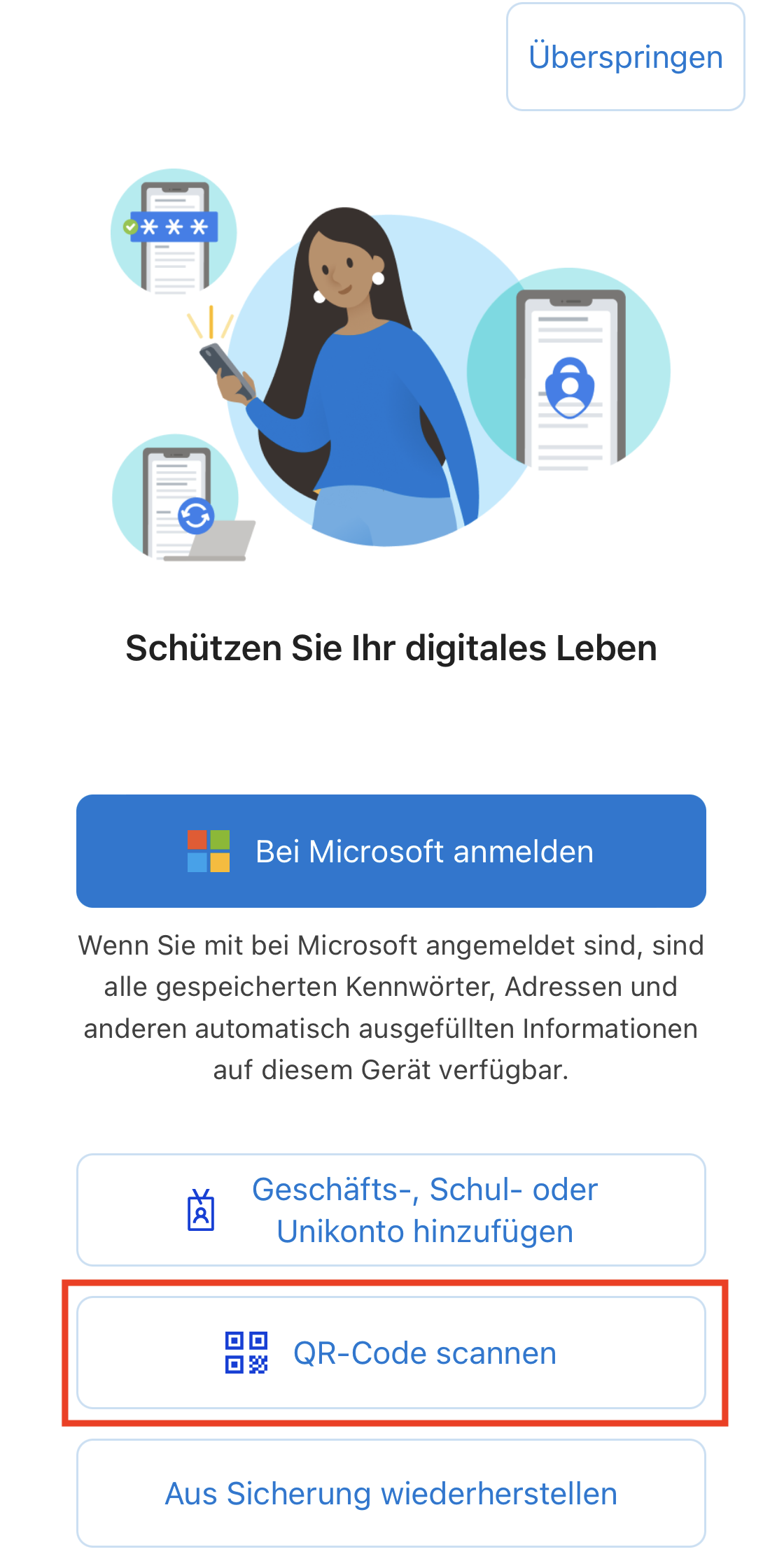 Falls die App frisch installiert und/oder noch kein Konto eingerichtet worden ist, auf dem Startbildschirm mit «QR-Code scannen» starten: